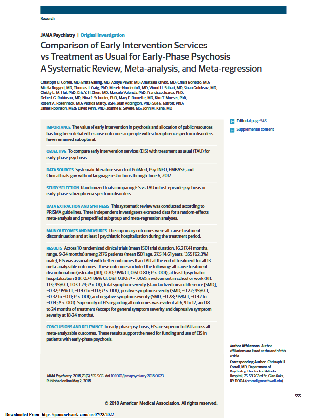 Η μελέτη των Correll et al. που δημοσιεύτηκε σε ένα από τα σημαντικότερα επιστημονικά περιοδικά της Ψυχιατρικής (JAMA Psychiatry) ανέδειξε σε παγκόσμιο επίπεδο την ανωτερότητα των δομών έγκαιρης παρέμβασης σε σχέση με τη συνηθισμένη θεραπεία σε μη εξειδικευμένες μονάδες (πχ εξωτερικά ιατρεία νοσοκομείου ή κέντρα ψυχικής υγείας) και συγκεκριμένα βελτίωση σε δείκτες συμπτωματολογίας, περισσότερες πιθανότητες ανάρρωσης και λειτουργικής επανόδου, λιγότερες υποτροπές νοσηλείες σε άτομα που εμφάνισαν πρώτο ψυχωσικό επεισόδιο.