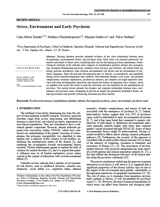 Η πρόσφατη μελέτη ανασκόπησης από ελληνική ερευνητική ομάδα (Xenaki, Dimitrakopoulos, Selakovic, Stefanis) που δημοσιεύθηκε σε έγκριτο διεθνές επιστημονικό περιοδικό ανέδειξε πως περιβαλλοντικοί παράγοντες (πέραν των γενετικών) εμπλέκονται στην αύξηση του κινδύνου για εμφάνιση ψυχωσικού επεισοδίου. Συγκεκριμένα, η σοβαρή, έντονα και επανειλημμένη έκθεση σε περιβαλλοντικούς κινδύνους, όπως προγεννητικές και περιγεννητικές επιπλοκές, τραυματικές εμπειρίες στην παιδική ηλικία (όπως κακοποίηση, παραμέληση), ψυχοκοινωνικοί στρεσογόνοι παράγοντες (όπως μετανάστευση ή εκφοβισμός) και η χρήση ουσιών (κυρίως κάνναβη) μπορεί να επιδράσουν αρνητικά στην ανάπτυξη του εγκεφάλου και να διαταράξουν την ισορροπία σημαντικών συστημάτων που σχετίζονται με το στρες και τη νευρομεταβίβαση, διαμορφώνοντας μια βιολογική ευαλωτότητα για μετέπειτα εμφάνιση ψυχωσικού επεισοδίου. Η ενδεχόμενη τροποποίηση αυτών των περιβαλλοντικών παραγόντων ρίσκου πιθανώς να λειτουργεί προστατευτικά και να αυξάνει την ψυχική ανθεκτικότητα σε σχέση με την εμφάνιση ψυχωτικής διαταραχής.